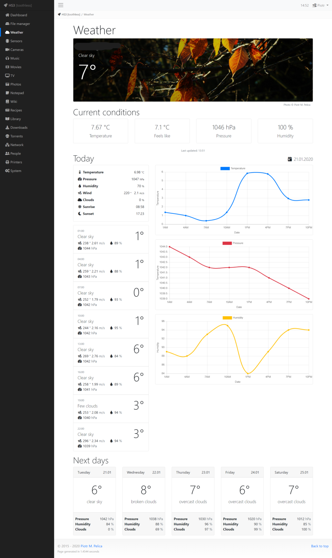 This time around I did a mix of all – the header displays the current data – which is the last reading from the openweathermap API, cached for an hour. Then the Current conditions section displays the live data from the sensors – kudos to my friend’s service – weather.net.pl.