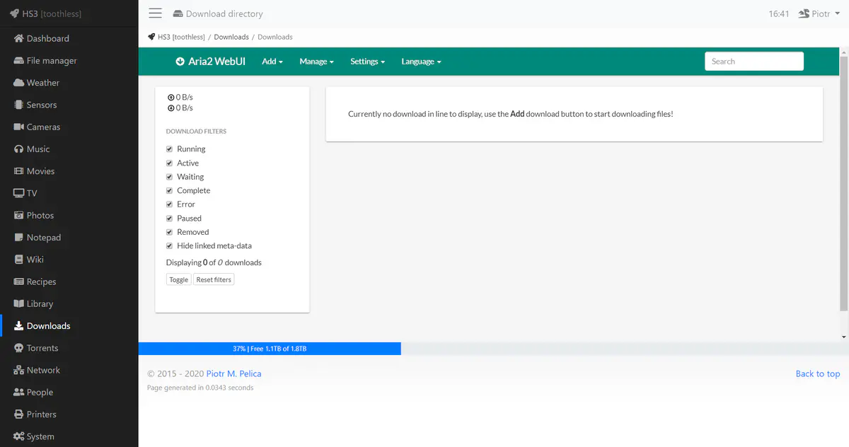 And Aria2 does just that. You install the service, configure it a bit, and voilà – it has an API. Then I’ve integrated WebUI into the HS3’s interface. I mean, at this point I could use the API myself, and I just might in the future. But as of now, I’m just lazy. And it does the job.
